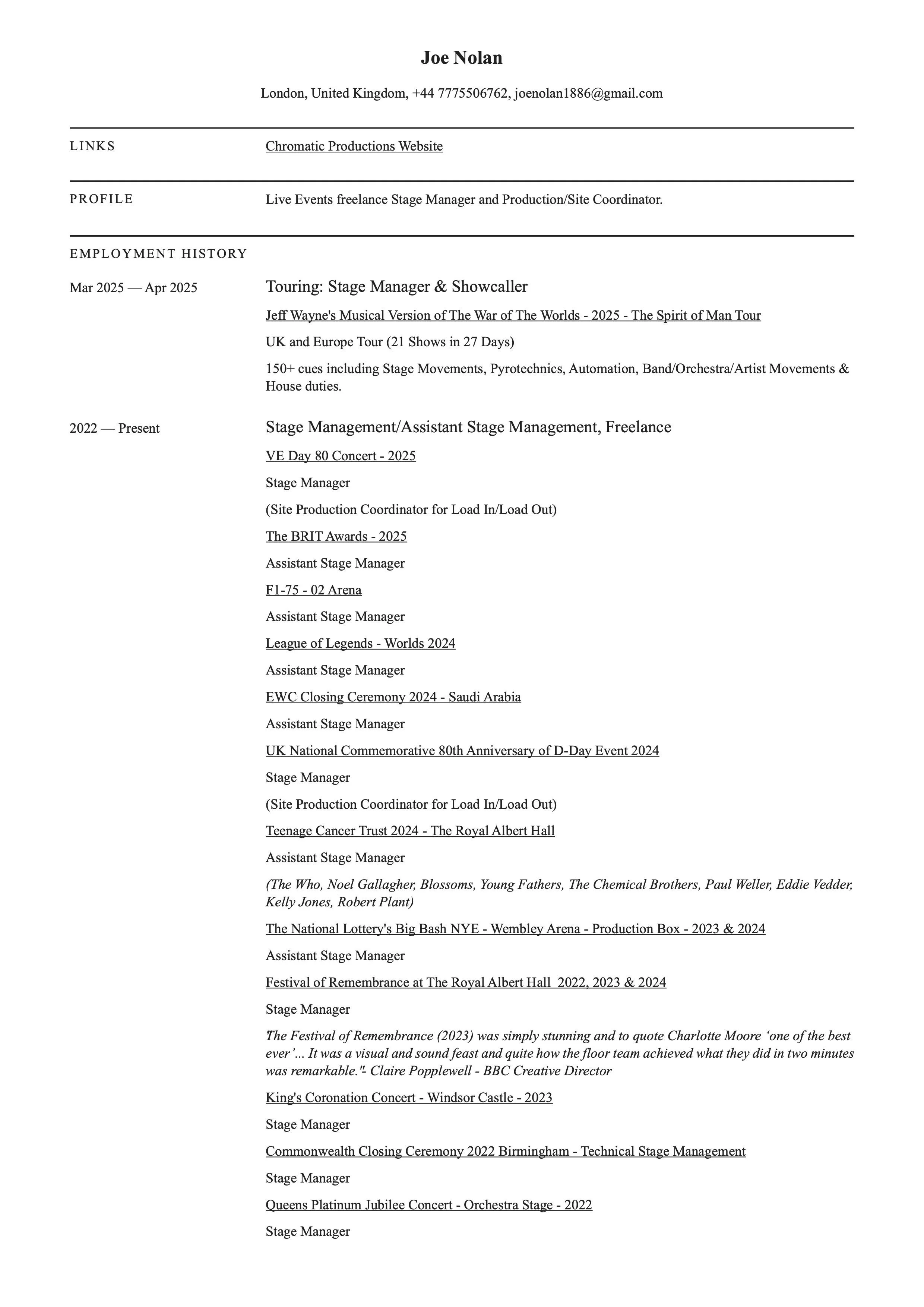 STAGE MANAGEMENT PORTFOLIO